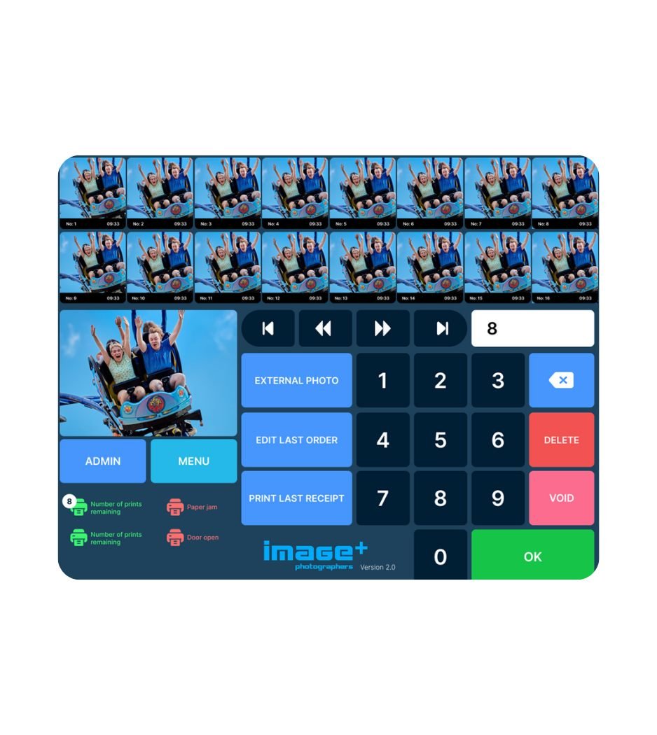 Image Plus is een foto-capturing en bestelsysteem dat wordt gebruikt bij achtbaanattracties in pretparken. De interface wordt ingezet bij de uitgang van de attractie, waar operators snel foto’s moeten selecteren, aantallen invoeren, bestellingen afdrukken en betalingen afhandelen in een drukke, high-traffic omgeving.