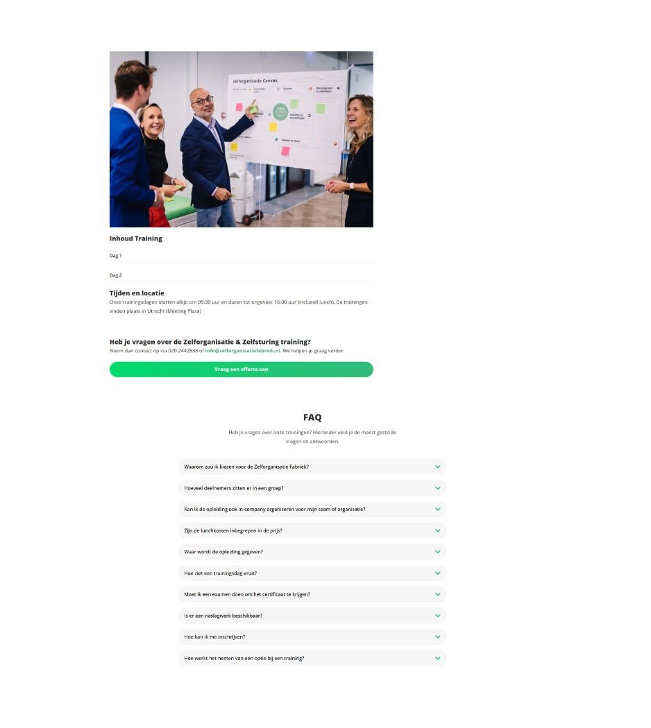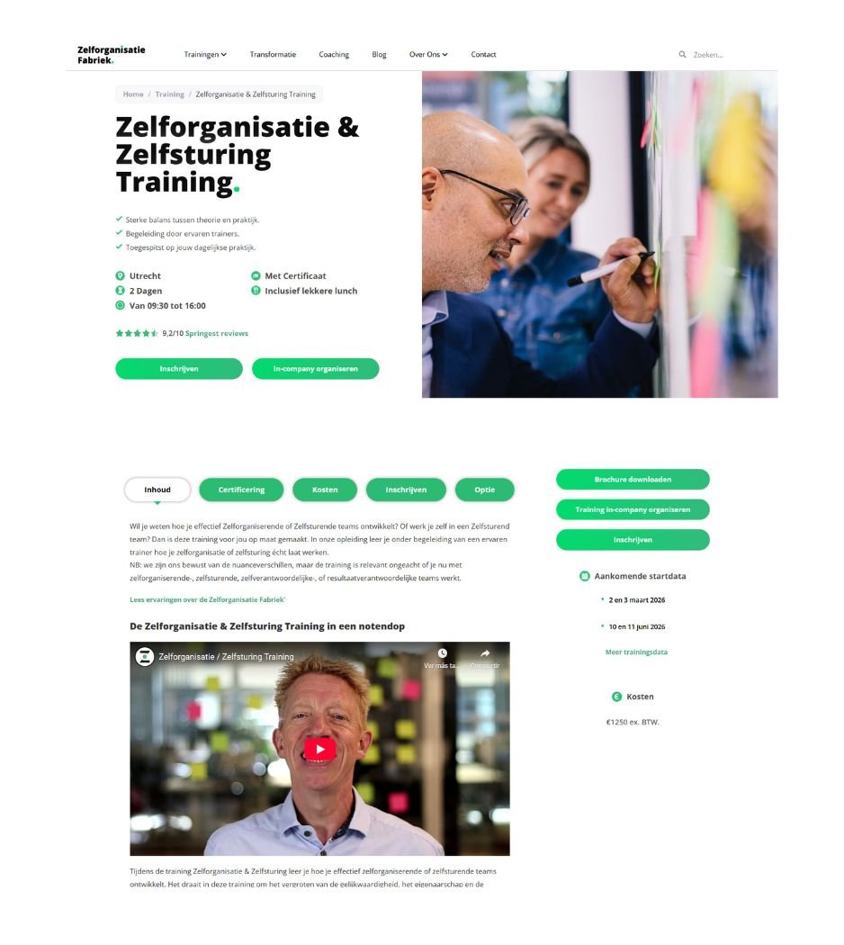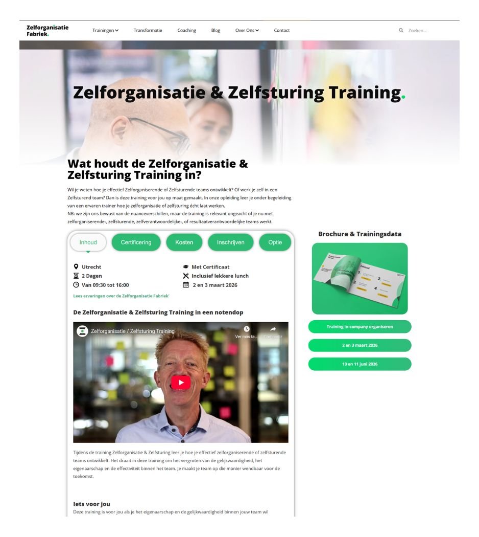 De Zelforganisatie Fabriek biedt trainingsprogramma’s op het gebied van zelforganisatie en zelfsturing. De trainingspagina is een cruciaal onderdeel van de website, omdat hier alle kerninformatie samenkomt en bezoekers worden begeleid richting inschrijving.
